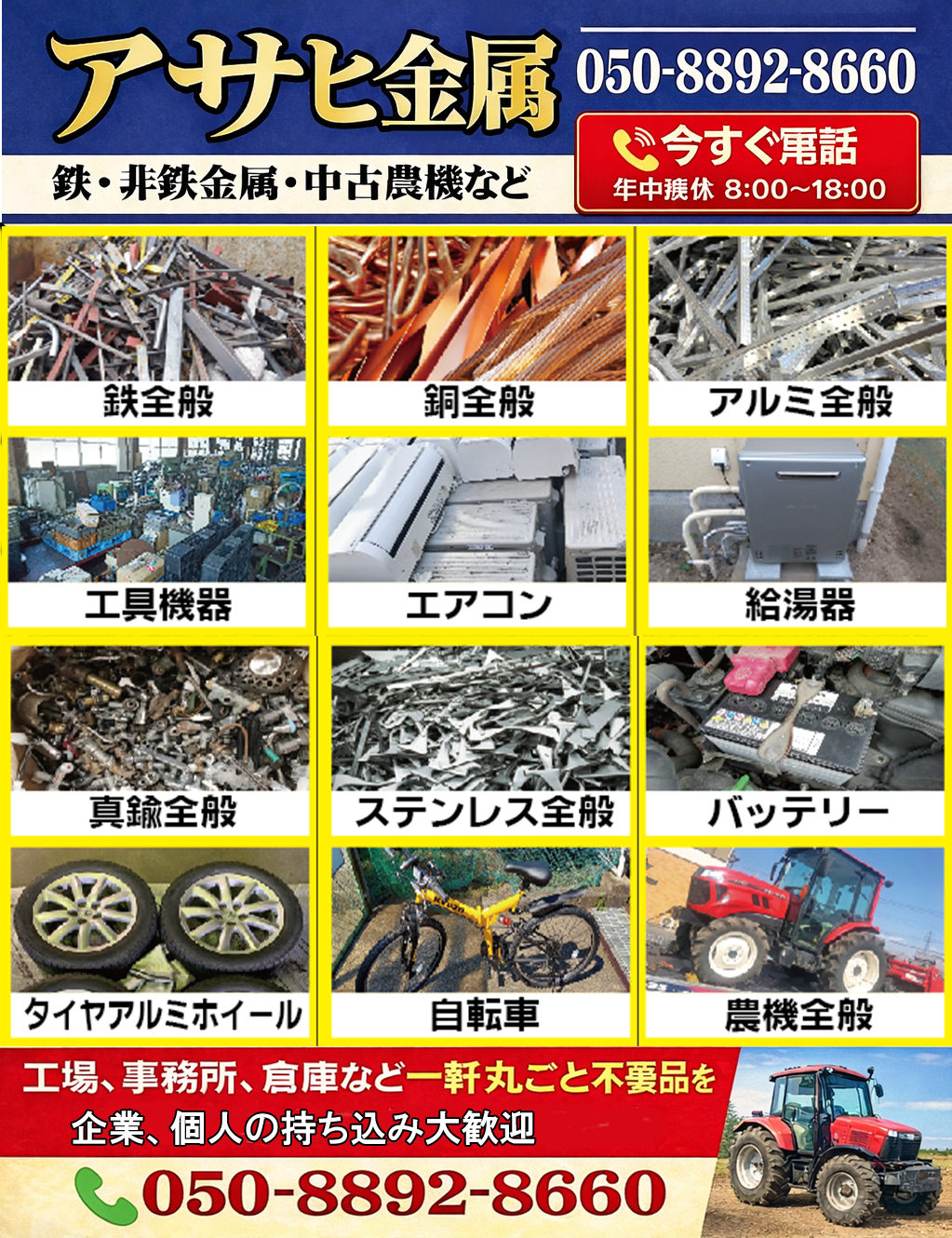 高価買取 鉄、アルミ、ステンレス、給湯器、バッテリー 皮線モーター PC関連 非鉄金属・工具類・ステンレス・アルミ買取 |